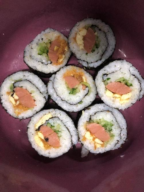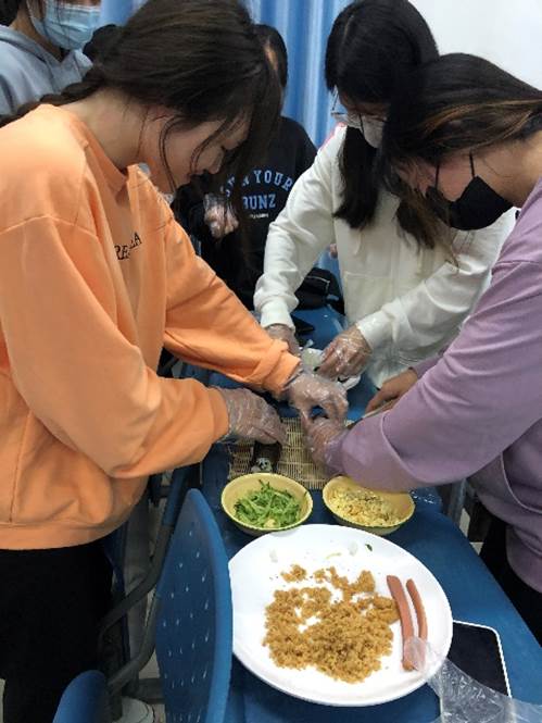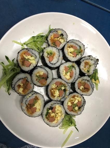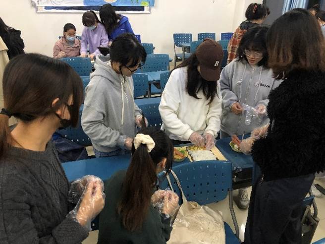 寿司制作看似简单,实则每一步细节都至关重要,精细考究。活动过程中,各组同学分工明确,合作有爱,欢声笑语不止。“独乐乐,莫如众乐乐。”众多同学的参与让寿司文化的传递充满了快乐与温暖,大家在亲自动手丰衣足食里体验了劳动的乐趣;在寿司文化的熏陶里品读日本人对于粮食独有的敬畏之心。