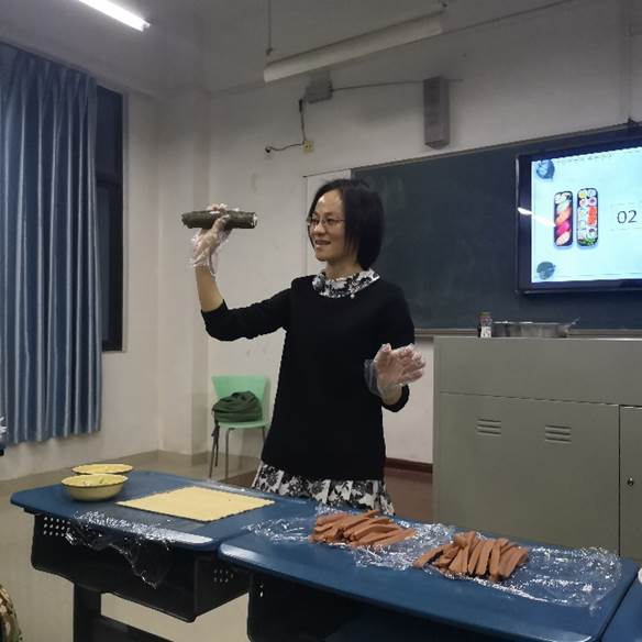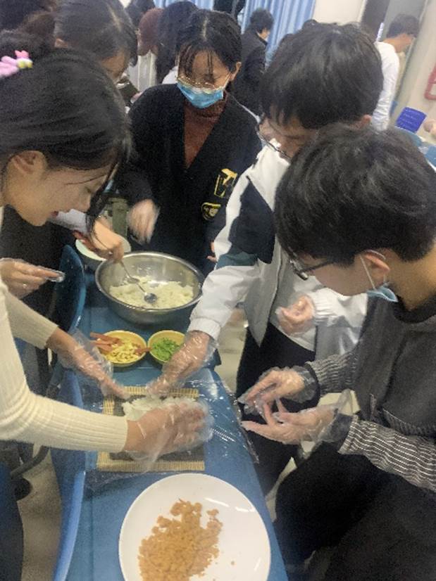 终于轮到同学们自己动手了。来自不同院系的同学们敞开心怀自由攀谈、自由分组,每组都有一位小组长统筹安排。开始制作寿司了,各组不慌不乱,井然有序:铺上海苔后均匀铺呈拌了寿司醋与盐巴的米饭,再添加鸡蛋、肉松、黄瓜、火腿等原材料。到了卷寿司这一步,可是充满了智慧,用力均匀才能卷得恰到好处。第一次尝试,有人成功卷出紧密度恰切的寿司卷,有人因为用力不足寿司卷略显松散,不过,切开后,依然是瞬间一扫光。口里留着寿司的余香,组员们你一言我一语里探讨成功的关键,终于,第二次圆满地做好了浑圆紧实的寿司卷,引来阵阵掌声。一卷又一卷,大家越来越娴熟,气氛越来越热烈……一盘盘精美的寿司轮番上场,一张张笑脸温暖了冬夜,一次次合作连接了陌生的心灵。