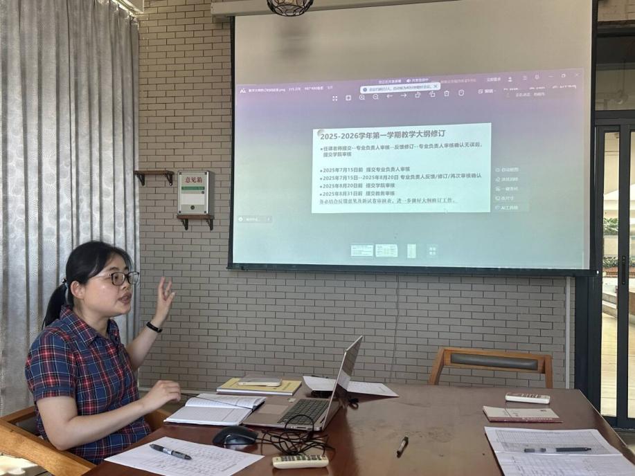 本次会议围绕教学大纲修订、暑期教师培训、毕业论文及期末材料提交等重点工作进行深入研讨与周密部署。会上,教学大纲修订工作成为首要议题。包晓丹老师强调,教学大纲是人才培养的核心纲领,要结合学科前沿动态与社会实际需求,优化课程体系与教学内容,确保培养出符合时代要求的人才。各位新学期任课老师务必结合反馈意见,进一步做好大纲修订工作。