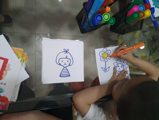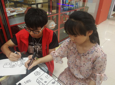 在面对即将到达的五一,志愿者们干劲十足,不一会儿就迎来了很多可爱的小朋友。上图便是志愿者耐心的教小朋友画画,我们采取一对一且跟画的形式,使小朋友们更好的吸收与学习。