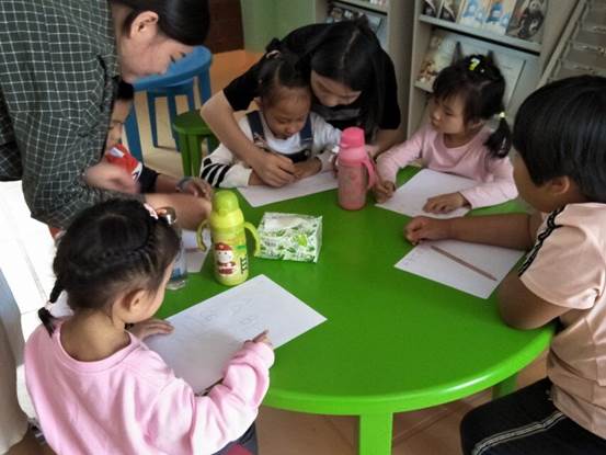 (崎沟村爱心英语义教活动的志愿者们在教孩子们写字母)