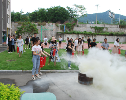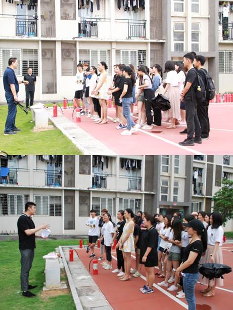 本次消防演练内容主要包括三个方面:火灾逃生演练;消火栓与干粉灭火器的使用方法与注意事项;实际灭火演练。随着校物业保卫人员按下警铃,文体中心的员工在老师们的疏导下从最近的安全出口有序撤离文体中心,前往公寓区篮球场集合。随后,校物业保卫人员林相洲为全体师生做了消防安全培训,详细讲解了消防栓与干粉灭火器的正确使用方法及注意事项。经专业指导,全体师生每人实地操作一瓶手持干粉灭火器进行灭火演练,亲身体验使用灭火器灭火的过程。