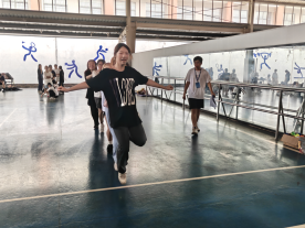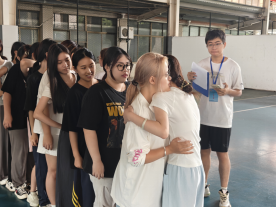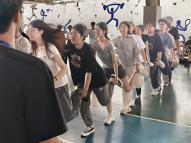 随后“链接加速”项目将活动推向高潮。各小组排成纵队,后一位紧抓前一位左脚、搭住右肩,以单脚跳跃前进。途中若脚着地或手脱肩,需加时并原地重发,但同学们始终同心协力,即便有失误也不气馁,在彼此的加油声中坚持完成挑战,充分展现了团队凝聚力。