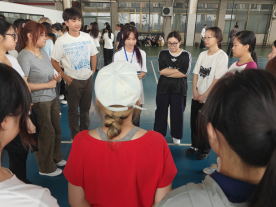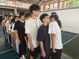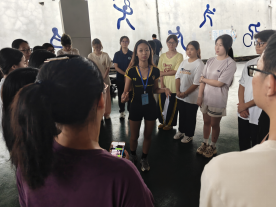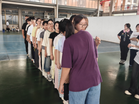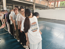 活动伊始,各小组负责人有序组织成员集合,一场充满协作与挑战的团队之旅正式拉开帷幕。首个项目“传球接力”率先点燃氛围,各小组按规则“脚跟贴脚尖”站队,首位同学用脖子夹球传递,完成后跑至队尾循环。过程中,有的小组配合流畅,球传递又快又稳;偶有小组出现手碰球或球落地的情况,便按规则从头再来,成员间相互鼓励、快速调整,每支队伍都为完成传递全力投入。
