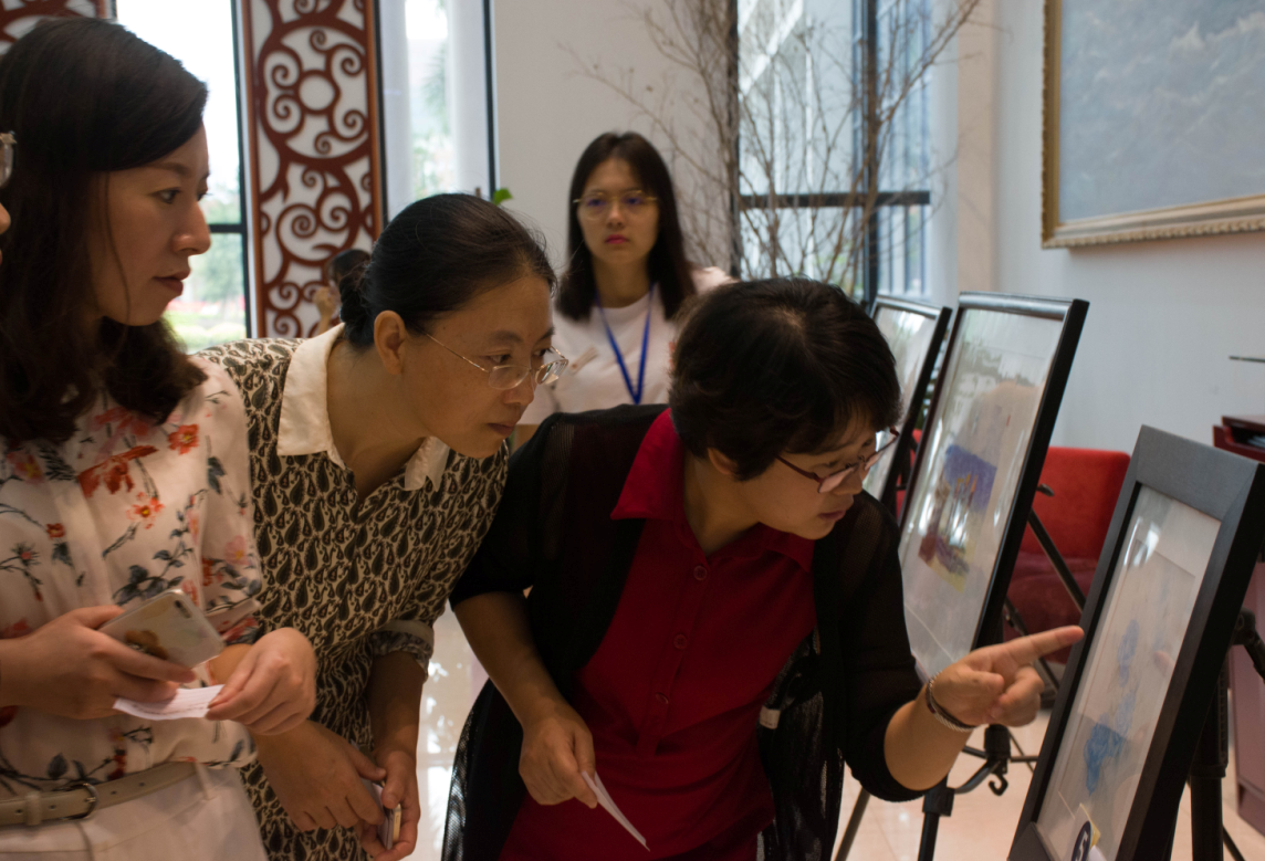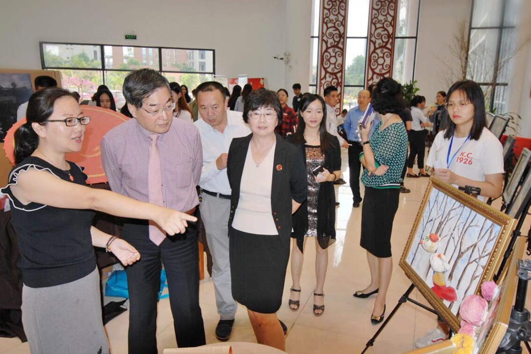 (公司领导兴致勃勃观展,盛老师为领导们讲解员工作品)