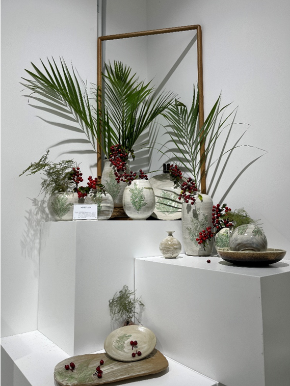 陶艺作品展示区, 由东瓦陶艺工作坊师生共同创作,这里展示了《瀚海未名者》、《蕉夏时光》等陶瓷系列摆件,这些作品传达出的对中国优秀传统文化的传承深深触动着每一位观展的师生。
