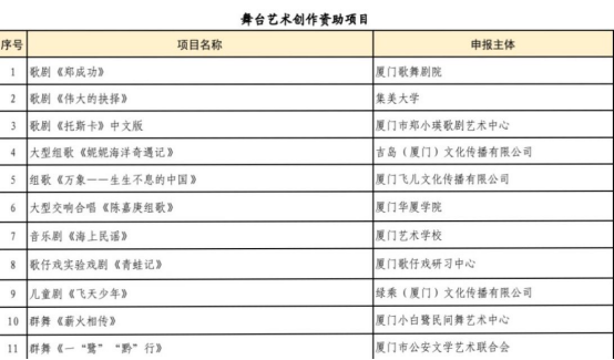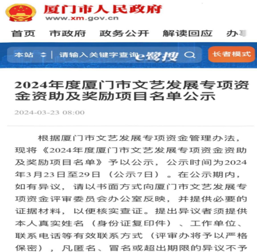 2024年度厦门市文艺发展专项资金项目经过受理申报、资格审查、国内专家初审、复审、终审、网上公示等程序,经厦门市政府部门同意,公布立项100项,其中舞台艺术创作项目为重要的支持项目仅有两所高校立项,公司为其中一所。