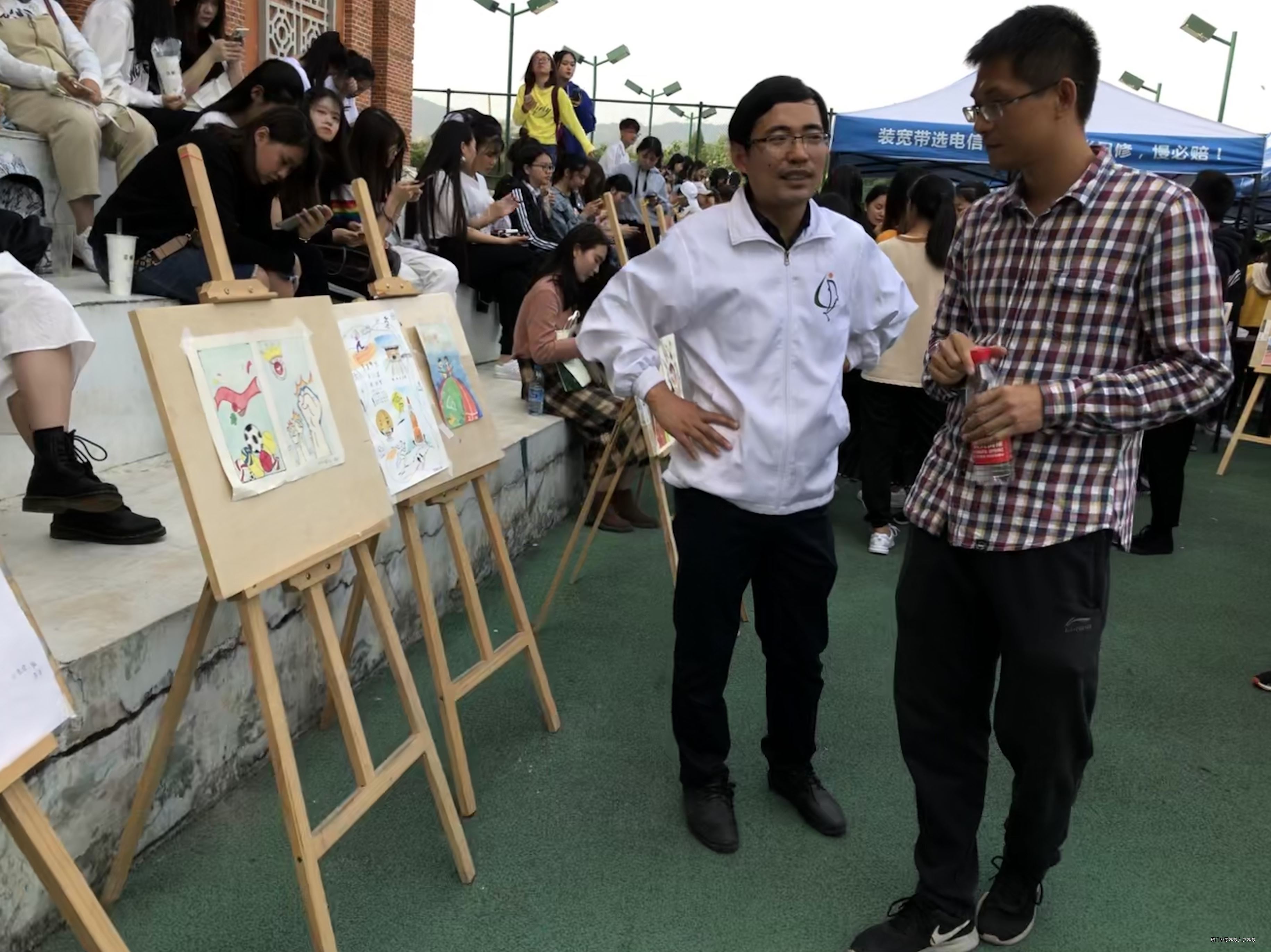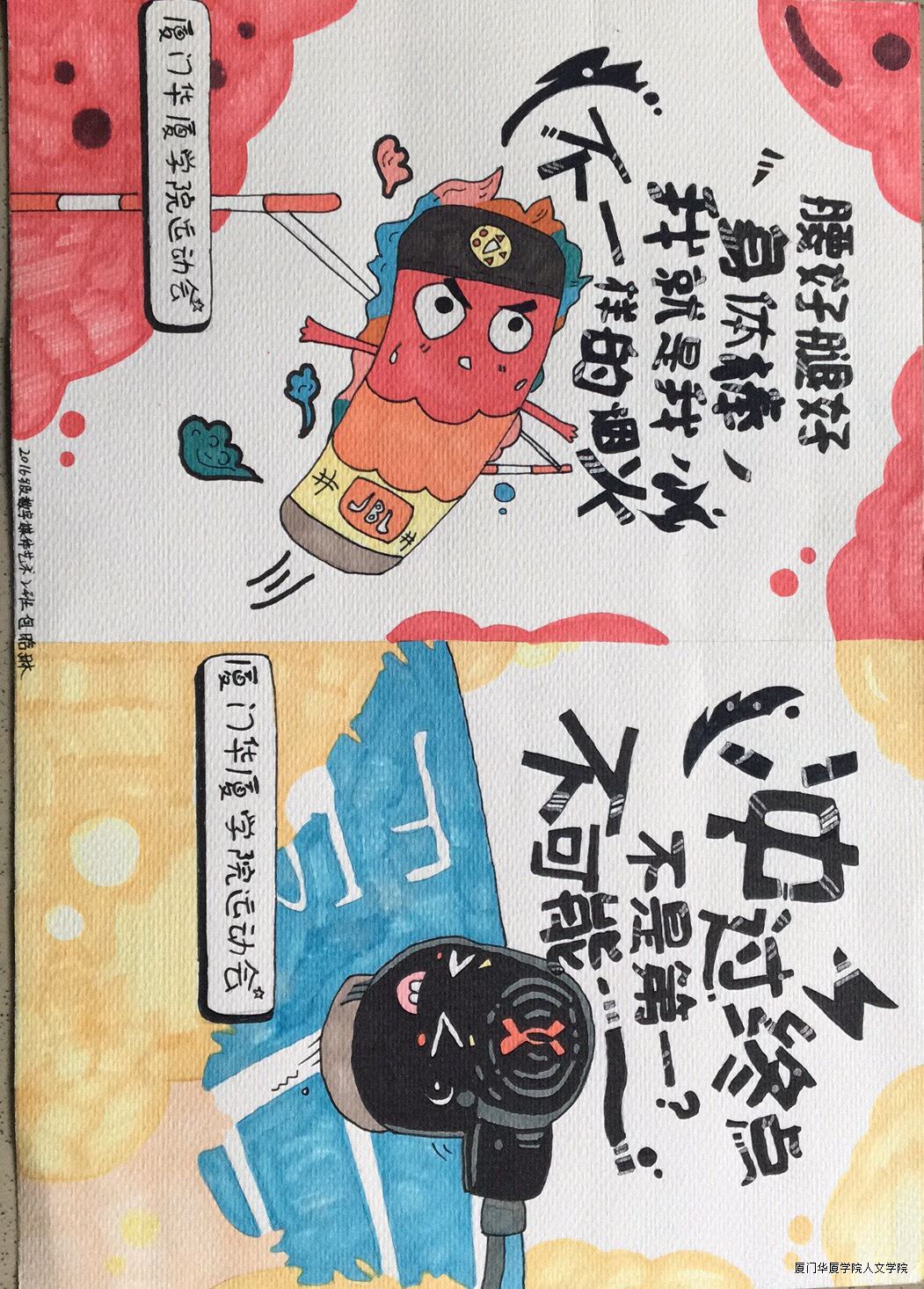 在本次创意文化展中,数字媒体艺术专业的同学泼墨挥毫,他们不仅笔触精到,而且琢磨巧妙、富有创意,创作出了一幅幅彰显公司学子艺术水平、且富有青春活力的作品。在微风的吹拂下,一幅幅色彩斑斓的画卷成为运动会上一道亮丽的风景线,令参展者为之叹服。经过评委老师的反复斟酌,包晗琳同学获得一等奖,唐思情同学获得二等奖,陈晓颖、林思莹组合获得三等奖。