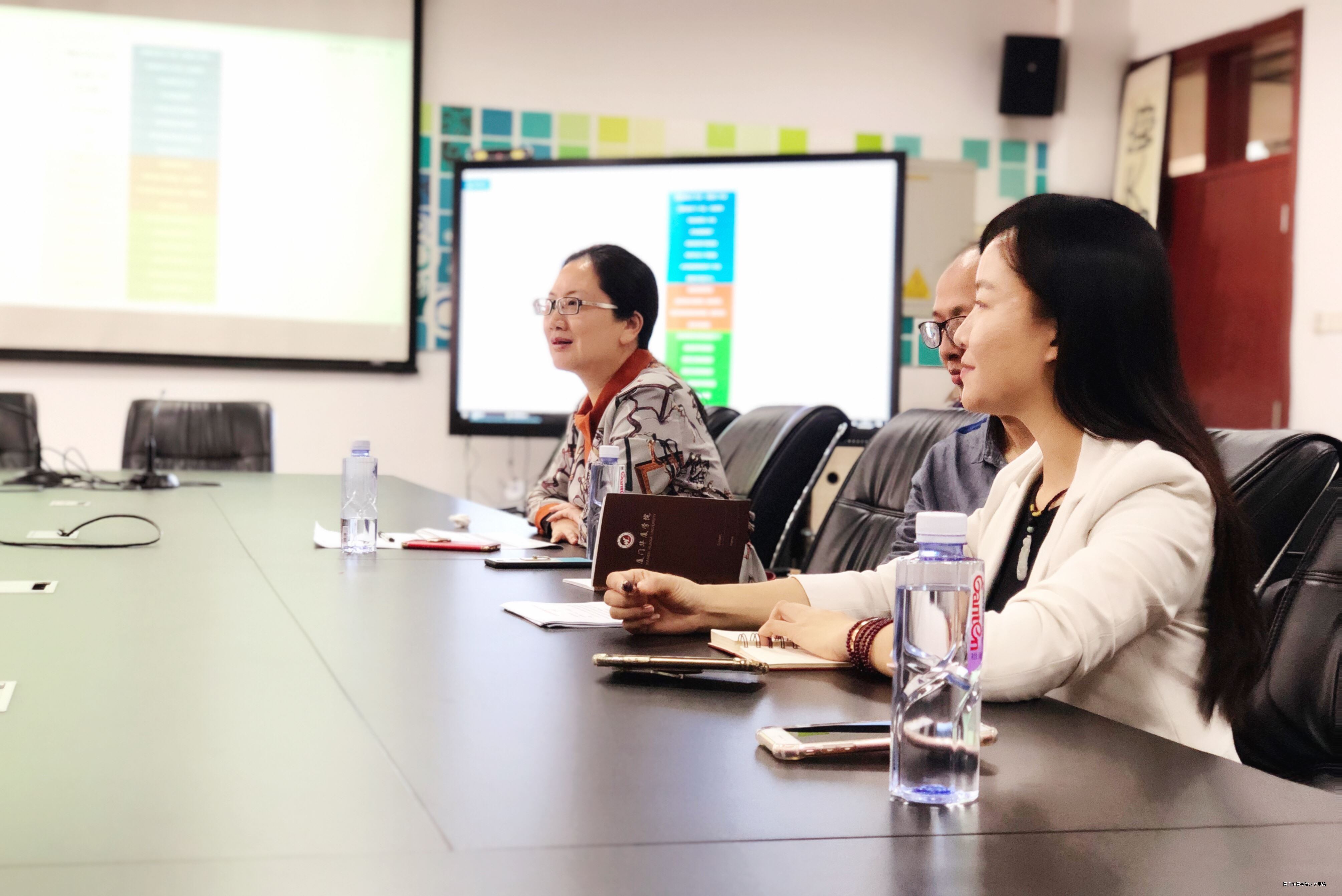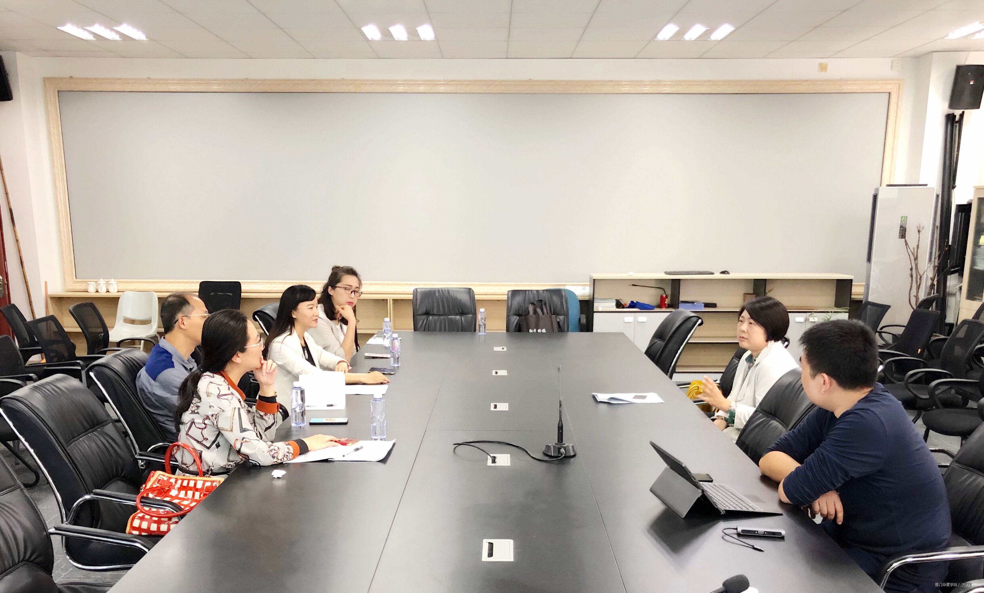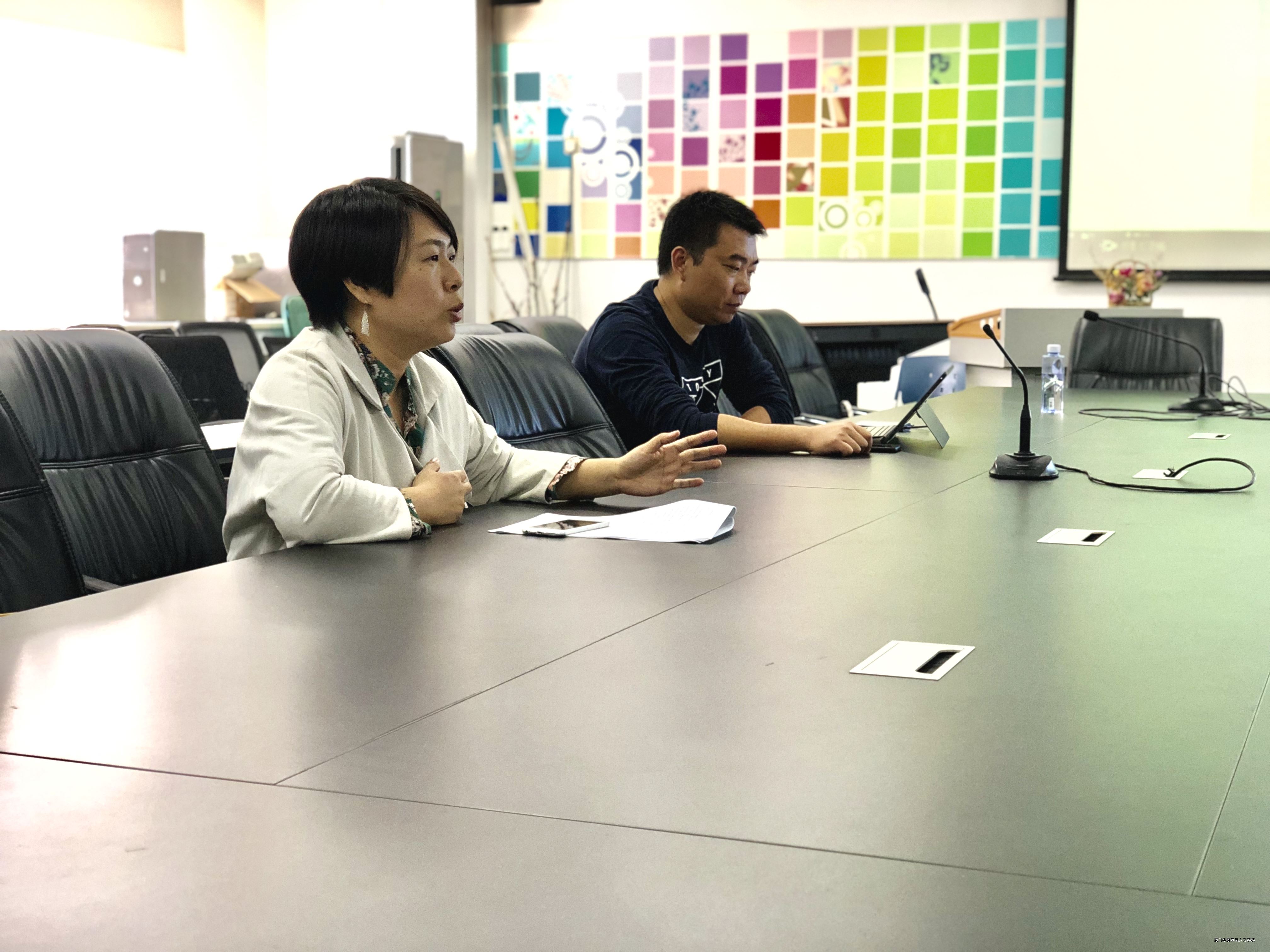 交流会上,盛映红老师简要阐述了此行主要目的:学习厦门理工公司新丝路时尚公司网络与新媒体专业建设成果、相关课程设计思路,以及实验室建设思路。