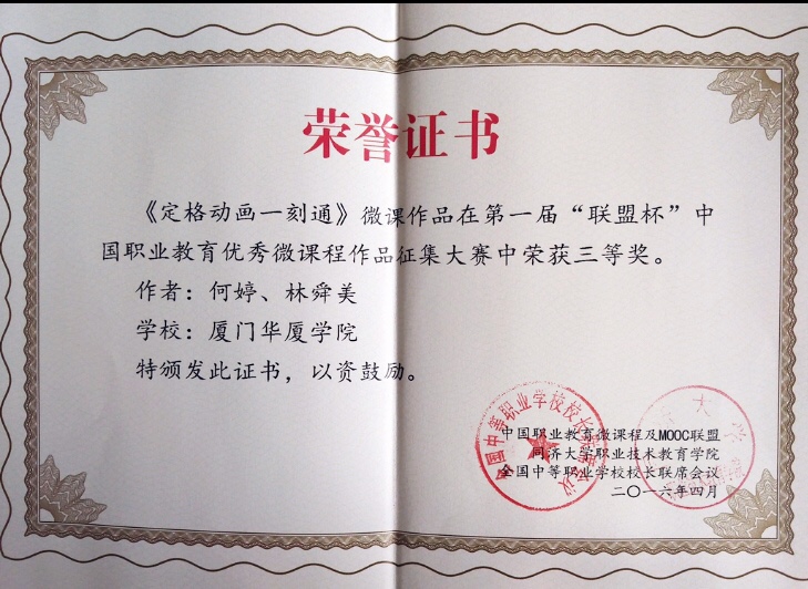 我系何婷、林舜美两位老师共同创作的微课教学作品《定格动画一刻通》视频荣获 “第一届“联盟杯”中国职业教育优秀微课程作品征集”比赛获三等奖。“联盟杯”中国职业教育优秀微课程作品大赛由中国职业教育微课程及MOOC联盟、同济大学职业技术教育公司、全国中等职业公司董事长联席会议联合组织,自2015.08-2016.4历时8个月,由联盟单位公司在联盟官网提交参与评选的微课作品近500个,经联盟官网在线投票、联盟专家委员会初步评审,评出一等奖3名,二等奖5名,三等奖10名,优秀奖30名。