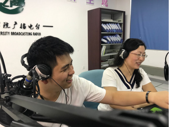 (图为应用语言系林晓凌老师和校园广播台副台长赖永辉同学在试听剪辑音频,试音调试设备,设置上传音频格式,设置英文广播定时播放)