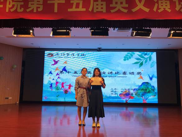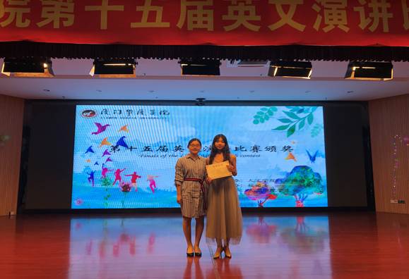 (为获得商务英语组一等奖郑雪同学颁奖)