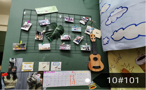 10#101宿舍的主题“友爱、自律、奋斗”,共同制作属于宿舍小集体的照片展示墙,记录属于她们大学的美好时光。可爱的床帘更显活泼,在活泼的外表下还有一颗整洁的心,整齐摆放的小物件,使宿舍显得更加清爽。并且做了一个学习计划打卡表,记录舍友学习进度,激发彼此的学习动力,推动集体进步。