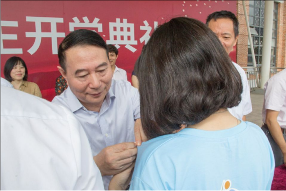 (开学典礼上,与会领导为bevictor伟德新生代表佩戴校徽)
