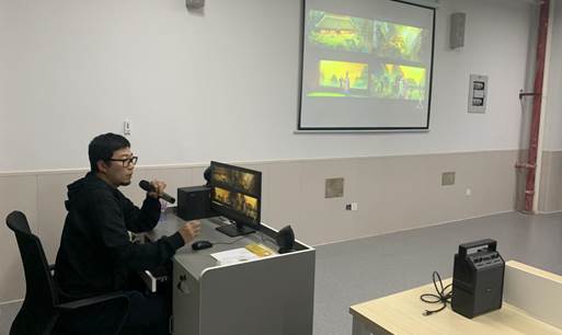 在会上,他主要以实际的商业案例分析,为同学们讲解了电影概念设计的一些模式和流程,并分享了在《哪吒之魔童转世》中一些场景的设计过程,包括设计元素的解析和前期设计的投入和调研,向同学们提前展示了行业标准和工作要求。