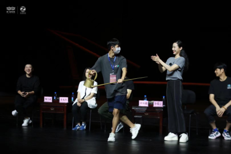 在主创访谈环节中,主创们各自分享了关于对自己角色的理解以及对舞剧《努力餐》的想法和感触。女主李香宇现场展示了“倒茶”的功夫,并邀请我系舞蹈方向的员工上台进行互动教学。