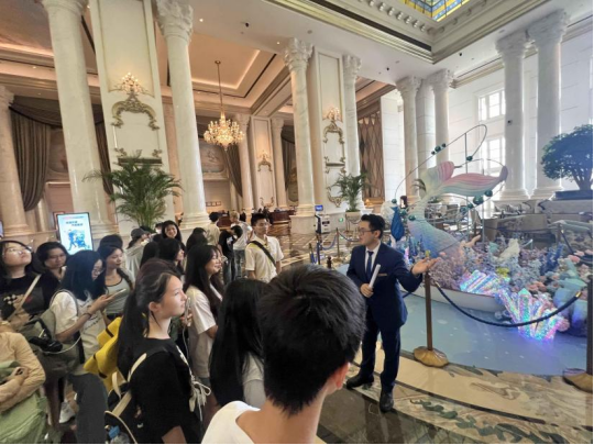 波特曼酒店的酒店大堂,外观设计,景观设计,体现了浓烈的法式建筑和园林风格,大堂具有巴洛克装饰风格。同学们参观了不同规格的套房,游览室外景观,参观啤酒屋。对现代化酒店的外观装饰,内部软装,外观景观设计有了直观的认知。