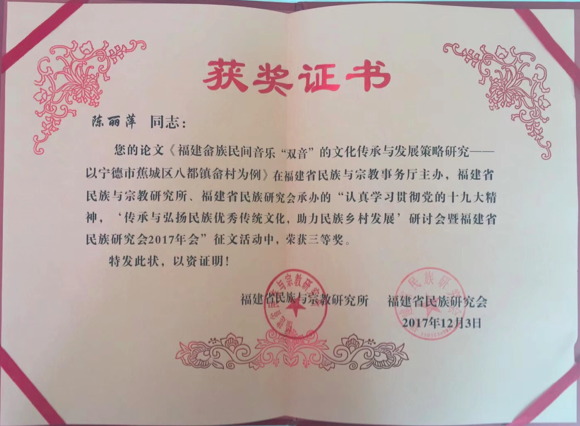 公司教师陈丽萍携文参会,在研讨会中发表了个人在保护和传承少数民族优秀文化上的浅见,撰写的论文《福建畲族民间音乐“双音”的文化传承与发展策略研究——以宁德市蕉城区八都镇畲村为例》荣获此次征文活动三等奖。