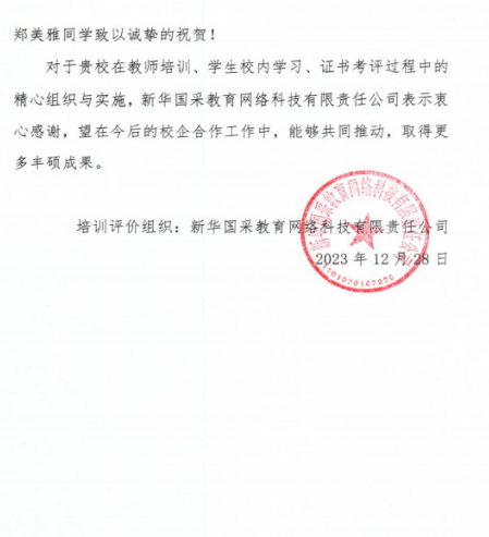 近日,新华国采教育网络科技有限公司发来贺电与喜报,祝贺公司在“2023年度1+X器乐艺术指导职业技能等级证书试点院校评选”活动中荣获“1+X器乐艺术指导职业技能等级证书示范考核站点”。在教师个人评选中,公司朱晓乐老师和曹睿老师获“优秀培训讲师”、常卉馨和蒋莉老师获“优秀考评员”、陈惠敏和赖镇平老师获“优秀考务工作者”称号。