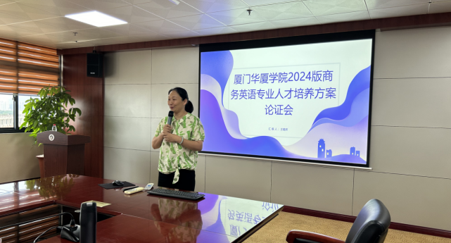 其次,商务英语专业教研室主任王艳芳老师详细介绍了商务英语的人才培养优化内容,主要通过前期大量的各层面调研,在课程设置方面优化了语言类基础课程,同时结合实际增加了商务实践教学。