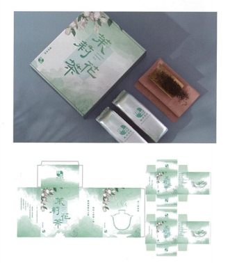 《福茶茉莉·茉莉花茶包装设计》作者王明宇。主题来源于福州市非物质文化遗产茉莉花茶。外封套包装引用了宋代诗人江奎赞誉茉莉花茶的一句诗:“客得茉莉无上味,列作人间第一香”。底部凹槽正面做茉莉花形状,背面为茶碟盘形状,并做茶杯形状的锾空开窗设计。内可展开盒包装设计,以茉莉花茶水做了由浓至清的变化配上茶叶与茉莉花瓣,当外封套抽拉开时形成开盒仪式感,内包装展开后盒内的立式插画也会随之展开。