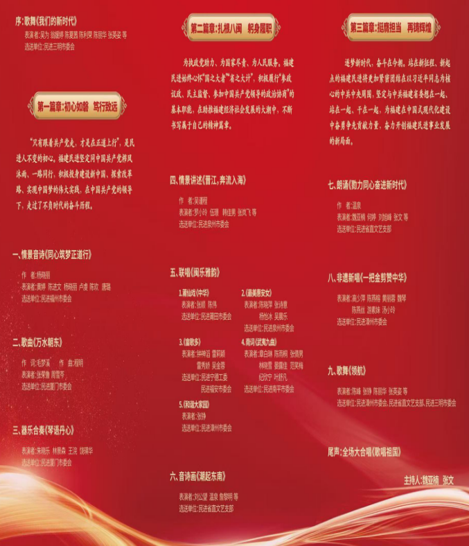 省政协副主席、民进省委会主委严可仕,省委会副主委郑家建、刘健、吴丽冰、马建荣等,以及来自全省各地的几百名会员代表齐聚一堂观看演出,共同回顾光辉历程,展望美好未来。此次文艺汇演分为《初心如磐,笃信致远》《扎根八闽,躬身履职》《挺膺担当,再铸辉煌》三个篇章,由各市委会、省直总支选送的优秀节目组成。