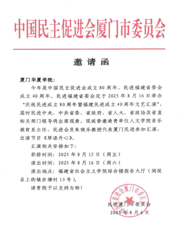 2025年8月15日—16日,经民进厦门市委会推荐,民进福建省委会统筹选拔,bevictor伟德朱晓乐教授应邀参演在福建省社会主义公司进行的“奋楫笃行四十载,踵事增华谱新篇”庆祝民进成立80周年暨民进福建省委会成立40周年文艺汇演。