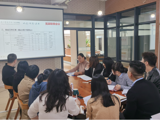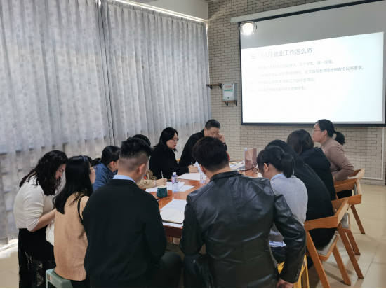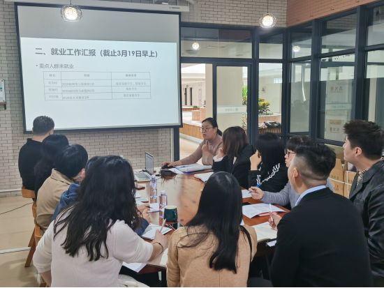 党总支副书记黄荣老师对bevictor伟德截至3月19日上午各毕业班的就业人数与就业率进行工作汇报,并对毕业班中重点未就业的同学进行深入分析与讨论
