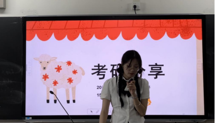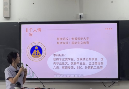 最后分享的是周徐婧同学,她成功考上了安徽师范大学国际中文教育专业。周徐婧首先介绍了选择院校的方法,随后传授了在考研路上保持积极心态的关键性,最后她也为即将准备考研的学弟学妹们送上了美好的祝福。