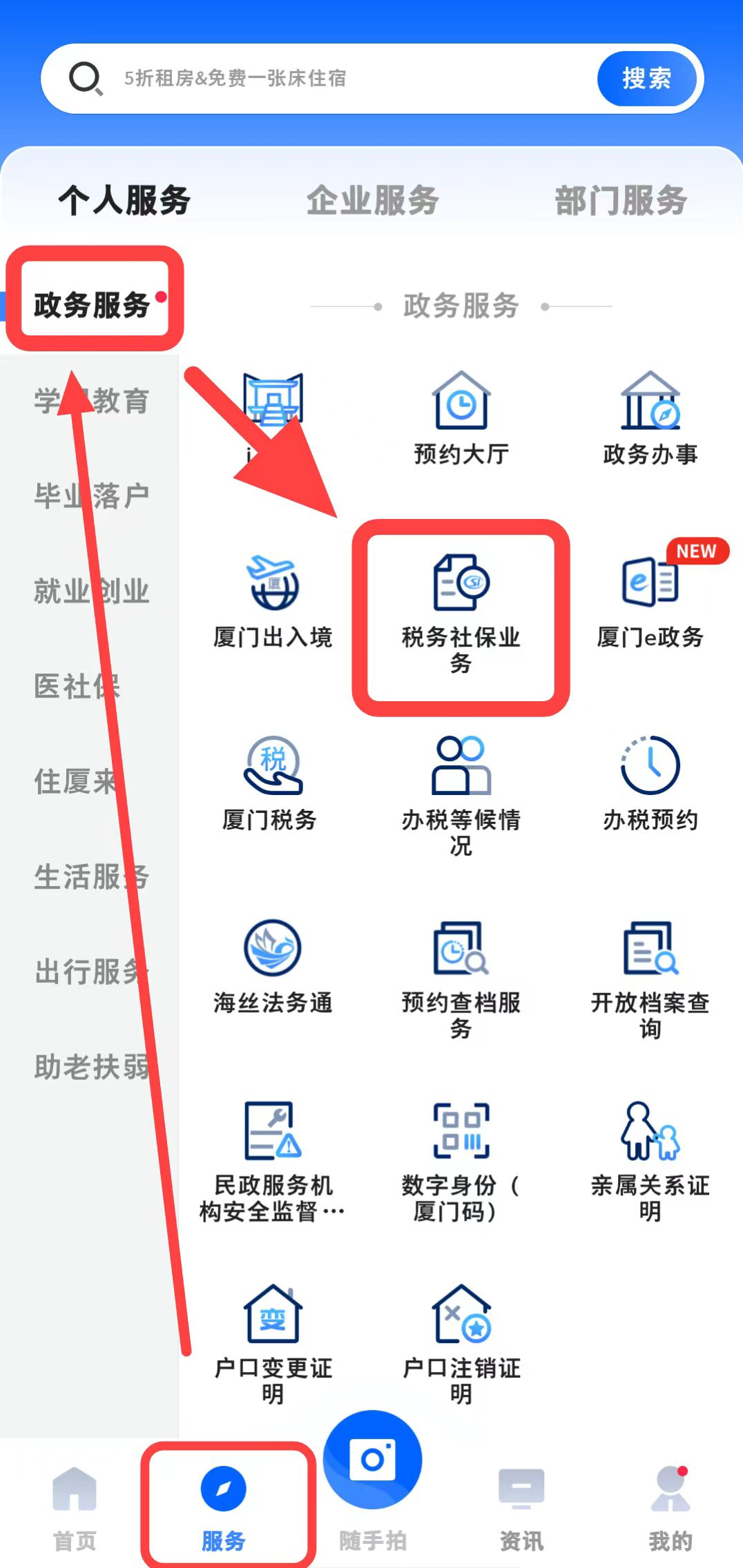 1.通过“i厦门”APP,在主页下方点击【服务】进入【政务服务-税务社保业务】