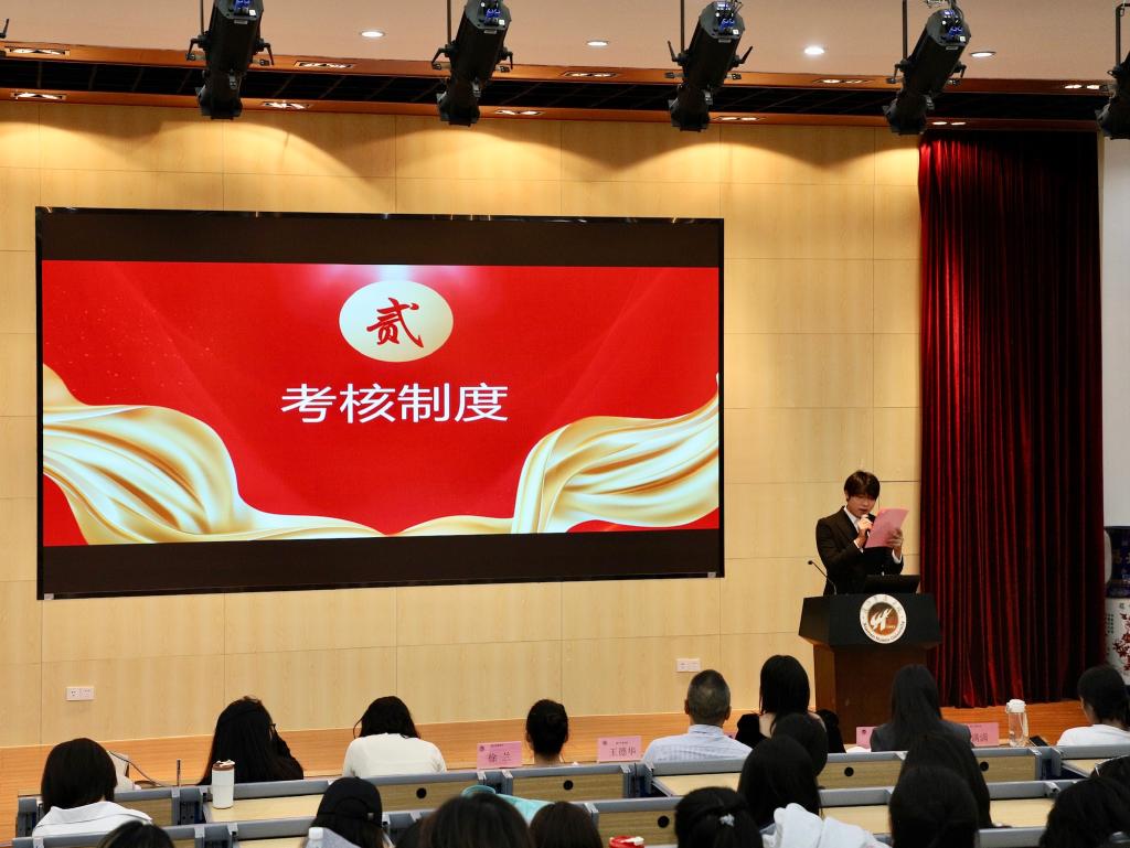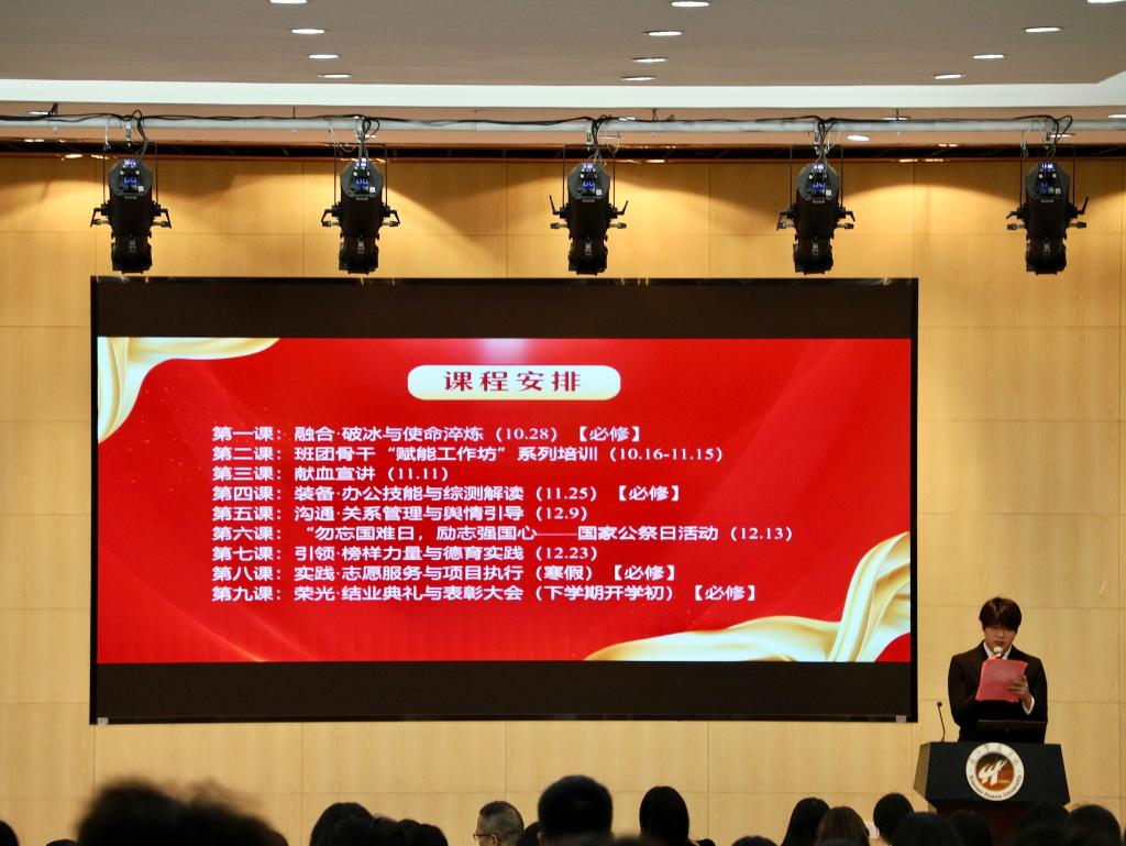 仪式第二项。王昊同学就本期培训考核方案进行详细解读。方案遵循“公平公正、全面客观、注重实效、动态发展”四项原则,参照《伟德国际体育官网德育学分实施方案(2024年修订)》相关规定执行,考核结果将作为评优评先、职务任免与学分评定的关键依据。