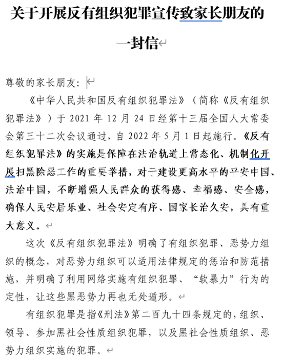 公司前期工作通过制作《反有组织犯罪法》相关宣传海报,撰写《关于开展反有组织犯罪宣传致家长朋友的一封信》,面向全院全体师生以及家长朋友们开展宣传教育,着力提升知法、守法、用法的意识和能力。