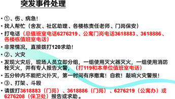 第三环节为强调宿舍安全。宿舍内严禁使用酒精炉及大功率电器,如电锅、电暖器等;严禁使用明火,如点燃蜡烛、酒精炉等;严禁私拉乱接电源线,发现绝缘层损坏的电线、开关、插座要及时报告。以及提出突发事件处理方案。在伤、病方面根据轻重缓急,应寻找合适的人员请求帮助。发现火灾应立即展开灭火行动,若火势太大无法控制,应及时拨打火警电话。对于打架斗殴事件,应立即拨打门卫、公寓办、保卫处电话。寻求帮助或报告。