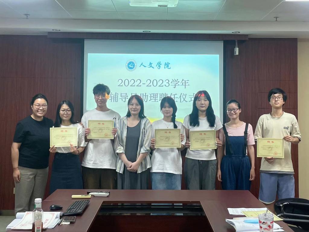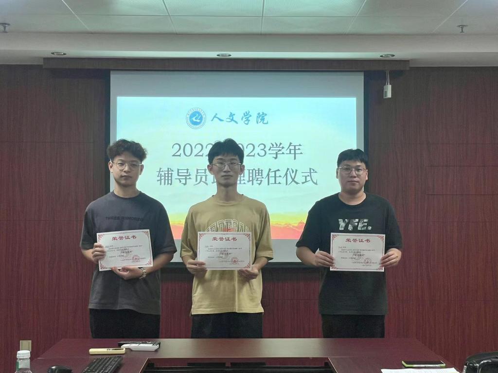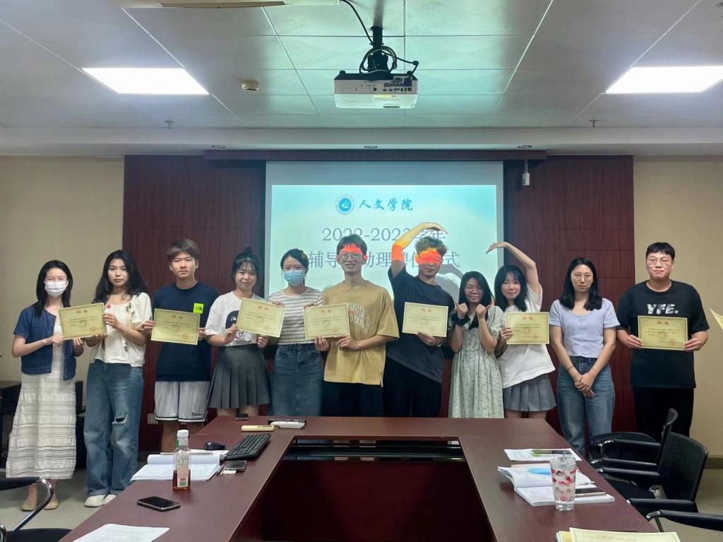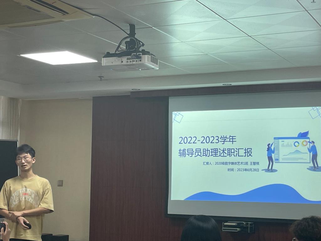 最后由辅导员张忺老师进行总结发言,对辅导员助理们的辛勤付出表示了肯定与赞赏,并由在场的9位辅导员进行现场投票,选举出2022-2023学年的三位“优秀助理”,分别是王智棋、陈斌、吴臻贤。会议的最后,由各个辅导员为助理颁发聘书。