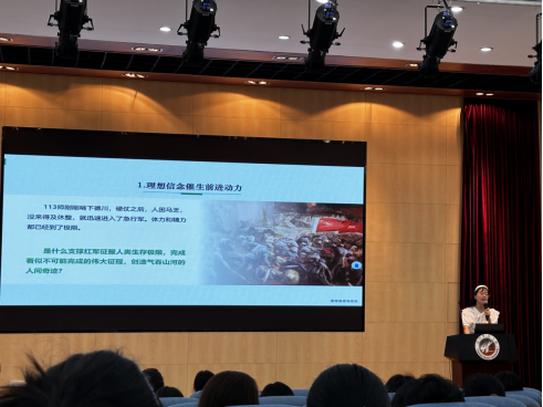 课程伊始,老师从“人为什么会仰望星空、这个星空是什么”进行问答,在星空的追问中点出马克思主义哲学三问。接着她阐述了理想信念的内涵,结合抗美援朝等红色故事,讲述了理想具有超越性、实践性、时代性的伟大特征。