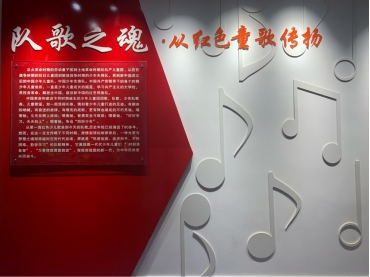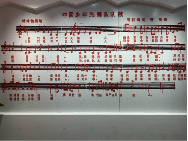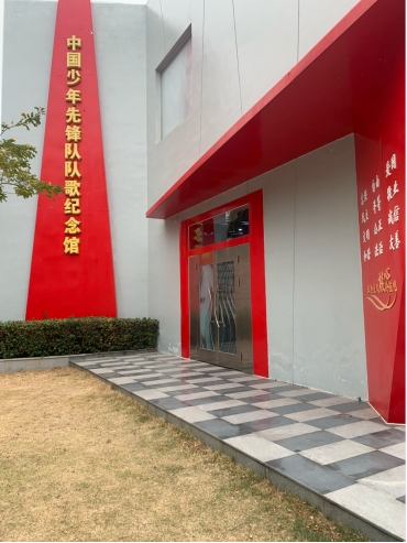 在老师的带领下参观中国少年先锋队队歌纪念馆, 走进展馆,迎面便是一整墙浮雕和红色的队歌曲谱,在中国共产党领导下,展馆对中国革命和建设各个时期传唱的红色少儿歌曲进行了全面梳理,在追溯解读中国少先队的发展历程的同时,展示了一脉相承的队歌精神。