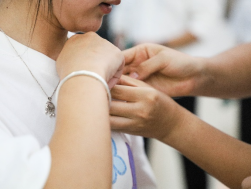 第二环节,佩戴团徽,新团员迈着整齐的步伐走到各位老师面前。老师们将团徽别在新团员的左胸前,并递上团员证。一枚枚金黄色的团徽,在灯光下熠熠生辉,如同为新团员们披上了“青春的勋章”。新团员们低头凝视着胸前的团徽,仿佛在与这份沉甸甸的责任对话。