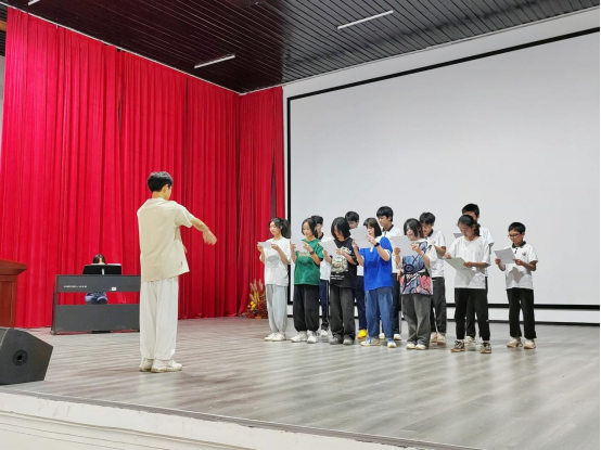汇报演出以唱歌、舞蹈、朗诵、英语配音等多种形式呈现。沿山中学的孩子们与支教团成员一同上台演出,现场其乐融融,氛围温暖而热烈。