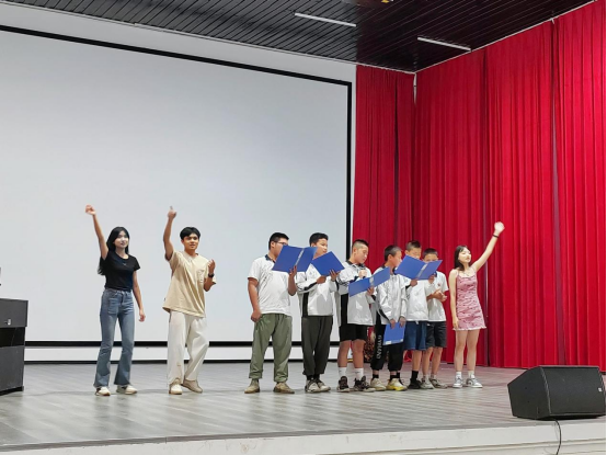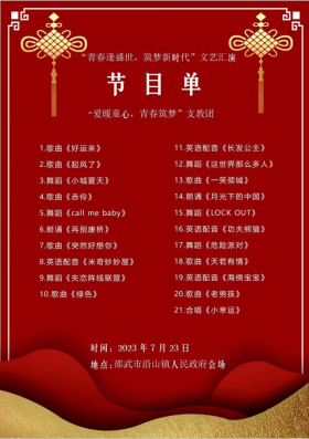 2023年7月23日早上九点,“爱暖童心,青春筑梦”支教团在沿山镇人民政府礼堂开展“青春逢盛世,筑梦新时代”支教成果汇演。本次汇演由文艺汇演和员工画展两部分组成,邀请沿山中公司领导及员工、沿山镇村民朋友们共同参与,通过线下活动和抖音线上直播同步进行。此次汇演不仅是对这段期间支教团教学成果的展示,更是希望传递青年奉献精神和弘扬社会正能量。