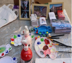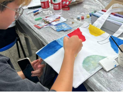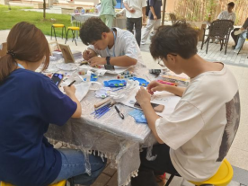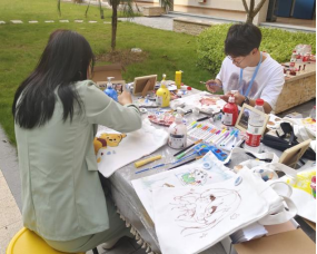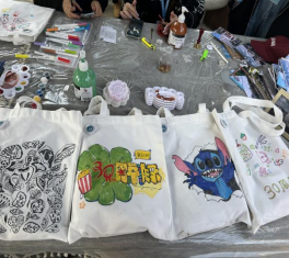 活动现场的同学们兴趣盎然地调配颜料,绘制出各式各样的图案。一支笔,几盒颜料,各式各样的图案跃然纸上,让原本空白的包包变得绚丽多彩、独具特色。一件件手工文创产品在同学们的奇思妙想中应运而生。