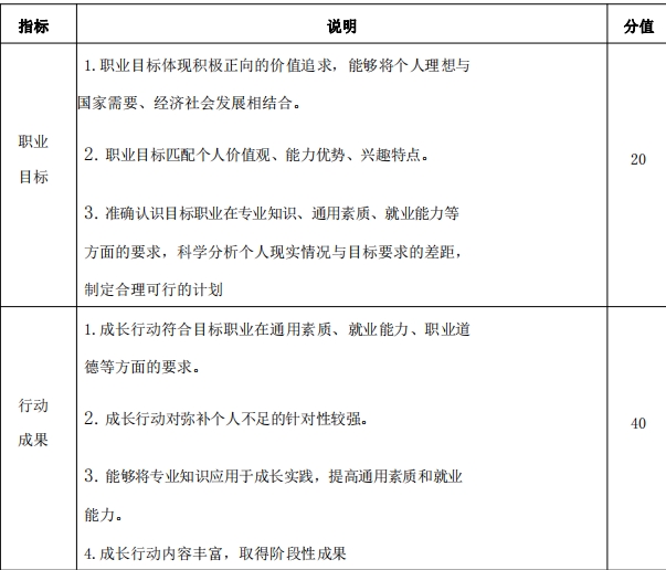 作品主要考察其职业发展规划的科学性和围绕实现职业目标的成长过程,通过学习实践持续提升职业目标达成度,增强综合素质和能力。