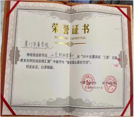 在校期间,她积极参加校内外文艺活动活动,如校庆演出、厦门集美音乐会、艺术团歌舞专场、2021年厦门市庆祝中国共产党成立100周年文艺晚会等,2020 年获福建省“我身边的战‘疫’”抗击新冠肺炎疫情网络原创作品一等奖。