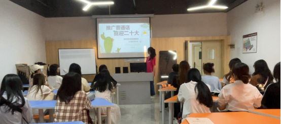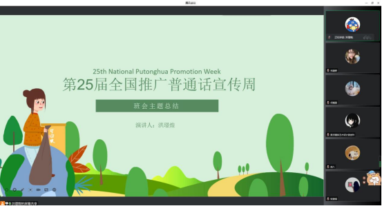 2021级商务英语1班围绕“第25届全国推广普通话宣传周”开展班会、演讲等活动,目的在于让同学们明白语言文字规范化标准化对于普及文化教育,发展科学技术,提高经济、社会的信息化水平,加强社会主义物质文明和精神文明建设,增进各地区各民族间的交流与沟通,增强中华民族凝聚力,均具有重要意义,争做推广普通话的接班人。