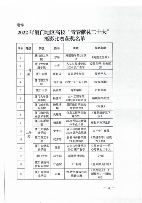 由中共厦门市委教育工作委员会办公室发起的“青春献礼二十大”摄影比赛活动,来自厦门市多家高校的学子们纷纷积极响应这个时代的主题,参加本次摄影大赛,该活动共收到作品130件。经院校自评、遴选推荐、专家评审等环节,公司20级网络与新媒体杨惠榕同学在“青春献礼二十大”的摄影比赛中荣获二等奖。