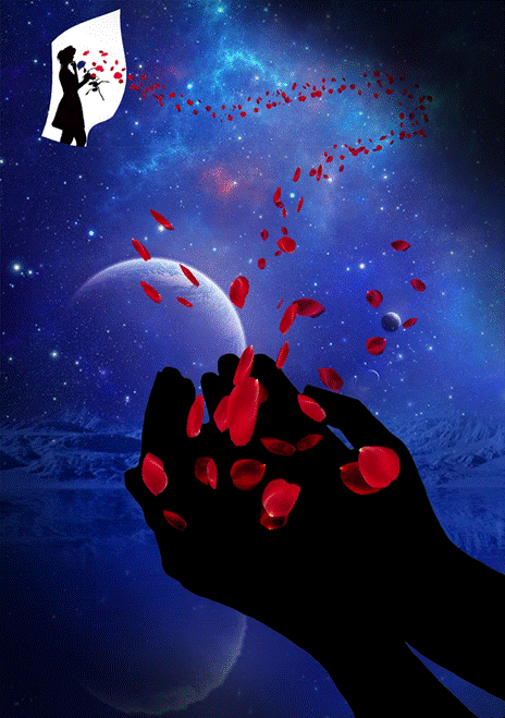 星空的裂缝中少女的玫瑰随着光倾泻而下,回转回转,来到一双手中,真实与虚幻交织,是谁从远方寄来的花,是她?亦或是他?救赎?我们无从辨别。无论是真实的花还是虚幻的花,都将让那神秘的黑暗的躯体慢慢升起一丝光亮,这就是星空下玫瑰的意义。我们向往这样温暖明媚的光芒,我们努力制造这样的光芒。