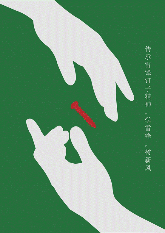 作品描述:以“手”呈现了雷锋的精神化形。双手的递接展现了传递之意,传递不锈的螺丝钉,传承不朽的雷锋精神。
