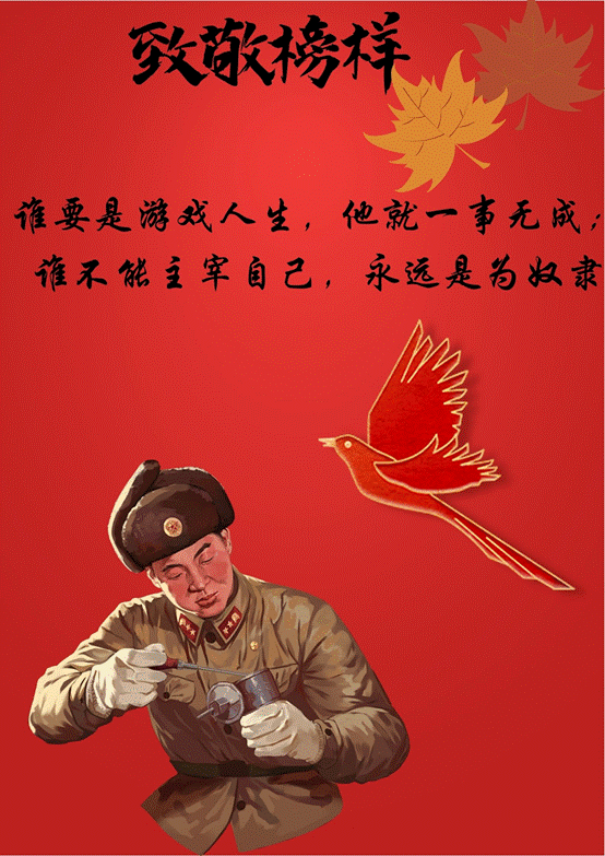 此作品创作灵感来自雷锋,以红色为背影体现中国精神以雷锋的好榜样为主题以及激励自己的句子为辅。