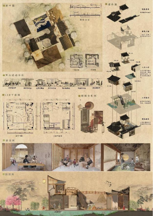 项目场地近正方形,将设计考虑以四合院形式,在保留一定历史感中进行创新。空间策略主要参考了“独乐园八景”的手法,考虑了年轻人、员工、中年上班族、老年人、小孩的需求,分成了“休闲区”、“阅读区”、“娱乐区”三大部分,再将其功能细分,满足各个人群的需要。形式各异的屋顶为用户的观赏提供了更多可能性,院子中间从屋顶延伸出来的墙和顶,让内外空间产生新的动态联系,摆脱了传统四合院庄重的刻板印象,使整体空间更加活泼生动。
