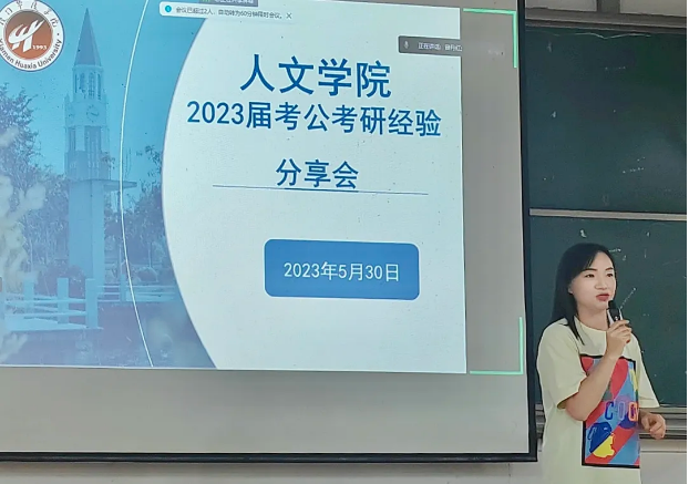 分享会由胡星老师主持,她向大家介绍了到场嘉宾和六位优秀考研考公学子。胡星老师希望同学们要认清考研考公的重要性、勉励同学们积极与学长学姐交流,明确现阶段学习目标。