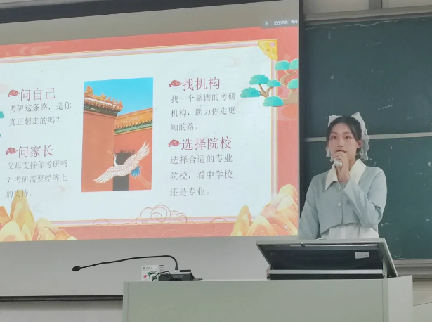 张玥林学姐根据当前考研形势为同学们做了介绍和分析,向大家讲述了自己的考研经历。其中重点分享了政治、英语的学习方法,勉励同学们在考研的过程中要掌握方法、科学备考。同时,她强调要注意劳逸结合,切不可一味埋头备战,充足的休息也是必不可少的。